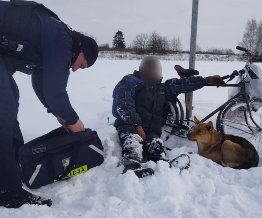 Na miejsce natychmiast skierowano patrol z Komisariatu Policji w Łapach. Funkcjonariusze, chcąc bezpiecznie dotrzeć do poszkodowanego, najpierw odwrócili uwagę psów, podając im jedzenie. Dzięki temu mogli pomóc wyziębionemu 64-latkowi. Jak ustalono, mężczyzna wracał ze sklepu, prowadząc rower. Przewrócił się i przez ponad godzinę leżał w śniegu, nie mając sił, by wstać.